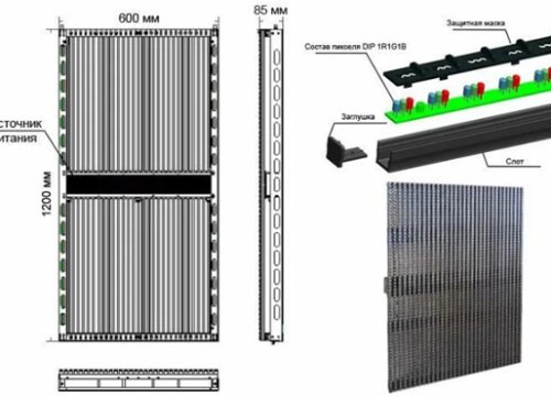 Медиафасад состоит из светодиодных модулей и скрепляющей сетки. В процессе производства медиафасадов используются, как правило, светодиоды типа Direct in-line Package (DIP). Это означает, что один светодиод состоит из трех светодиодов красного, синего, зеленого цветов. Для создания медиафасада требуется большое количество светодиодов, которые крепятся на специальной сетке. Сетка монтируется на здании, обеспечивая устойчивость медиафасада и целостное восприятие изображения. В отличии от медиафасада светодиодный экран устанавливается, как правило, внутри помещения, однако функции выполняет те же, что и медиафасад.