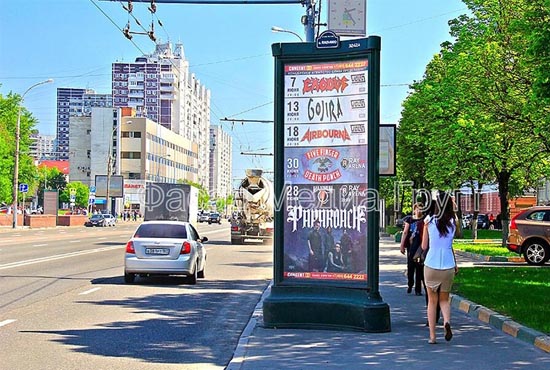 Наши клиенты часто задают нашим менеджерам вопрос: «Что такое тумбы и пилларсы?». Отвечая на данный вопрос, специалисты нашей компании указывают, что пилларс и тумбы представляют собой цилиндрическую рекламную конструкцию 1.4 м х 3 м., предназначенную для размещения рекламных постеров, имеющую, как правило, внутреннюю подсветку и стекло для защиты размещенных рекламных материалов. Пиллары имеют круговой обзор. Данный факт позволяет охватывать как прохожих, так и водителей, пассажиров транспортных средств. Эффективность размещения рекламы на пилларсах достигает 100%.