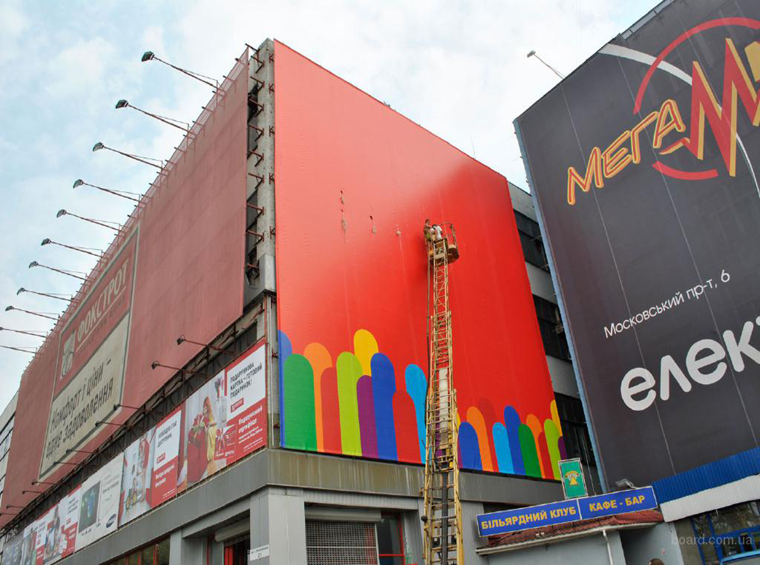 Рекламный баннер крепится к поверхности специальными тросами. При этом наши монтажники используют специальное оборудование.