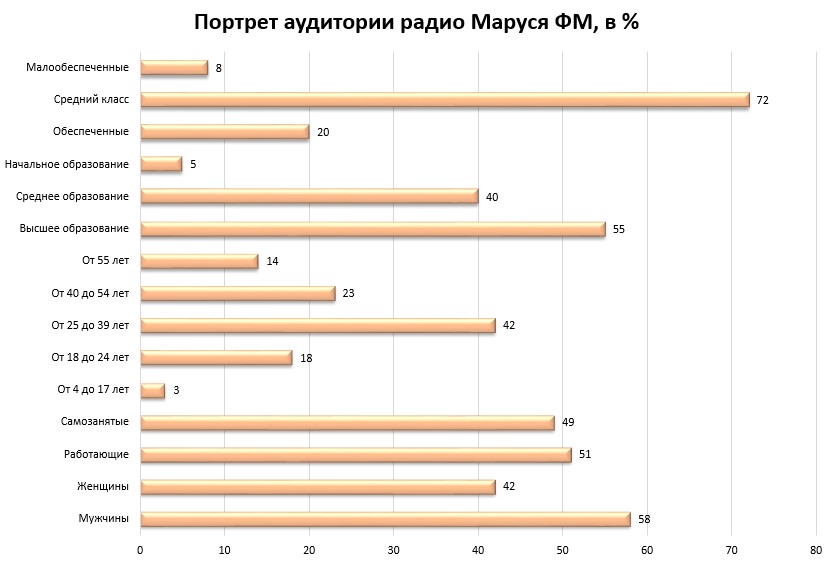 Благодаря качественному, сбалансированному контенту аудитория радио Маруся ФМ многочисленна и разнообразна.