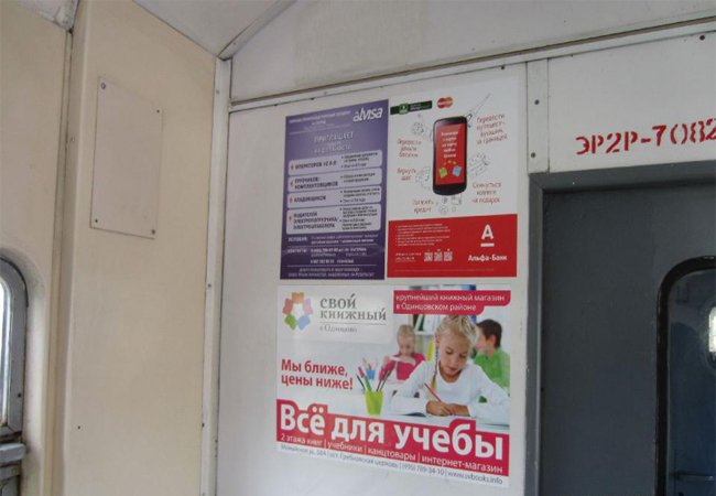 Монтаж рекламы в электричках осуществляется по-разному в зависимости от того, какой рекламный материал и где размещается.