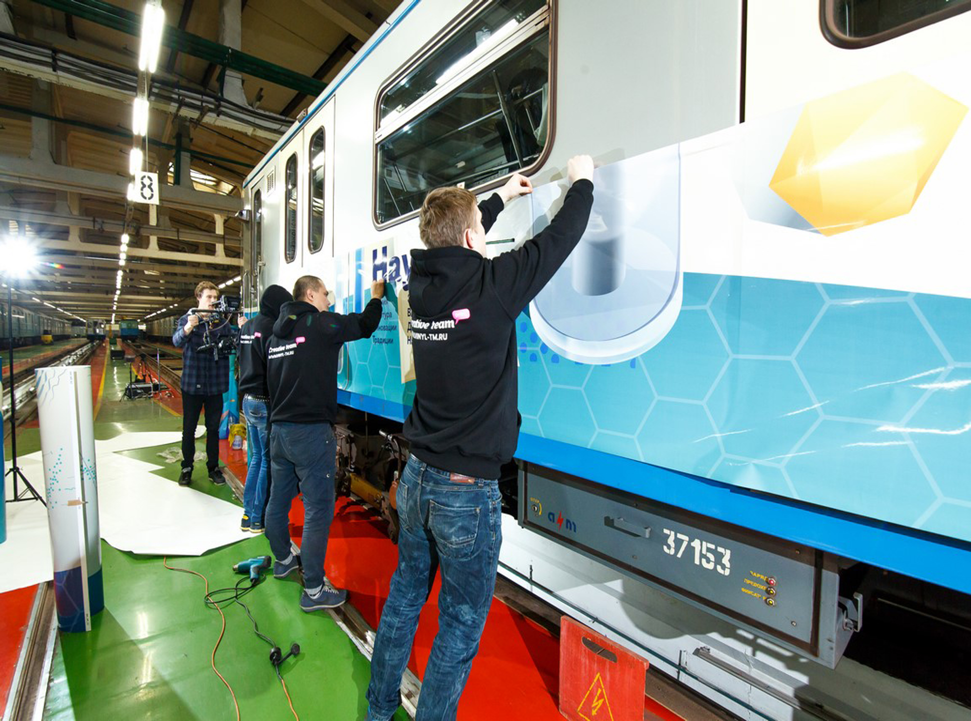 Пример брендирования поездов самоклеящейся пленкой представлен на фото: