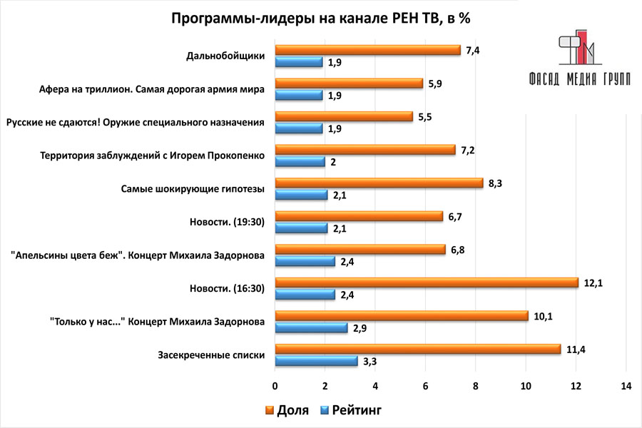 Популярность телеэфира на «РЕН ТВ» приводит к ежегодному увеличению спроса на рекламное время. Для привлечения клиентов из разных регионов России, увеличения процента продаж, повышения имиджа компании и узнаваемости бренда – размещайте рекламу на «РЕН ТВ». «РЕН ТВ» – это проверенный и востребованный канал для размещения рекламы на армавирском ТВ. Для размещения рекламы на телевидении обращайтесь в рекламное агентство «Фасад Медиа Групп». Будем рады сотрудничеству.