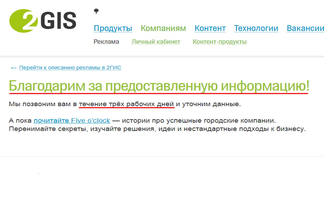 Процесс размещения рекламы в 2ГИС (Двагис, ДубльГис) должен анализироваться и заканчиваться подведением итогов. Рекламодателю, который не собирает статистику и не делает выводы из рекламной кампании, сложно будет понять, насколько эффективна была его рекламная акция, чего удалось достичь, а в чем были допущены ошибки. Обращаем внимание, что эффективность рекламной кампании в 2ГИС (Двагис, ДубльГис) не всегда прямо пропорциональна количеству обратившихся клиентов. Очень часто клиенты принимают решение о покупке товара или заказе услуги спустя некоторое время после того, как увидели рекламу.