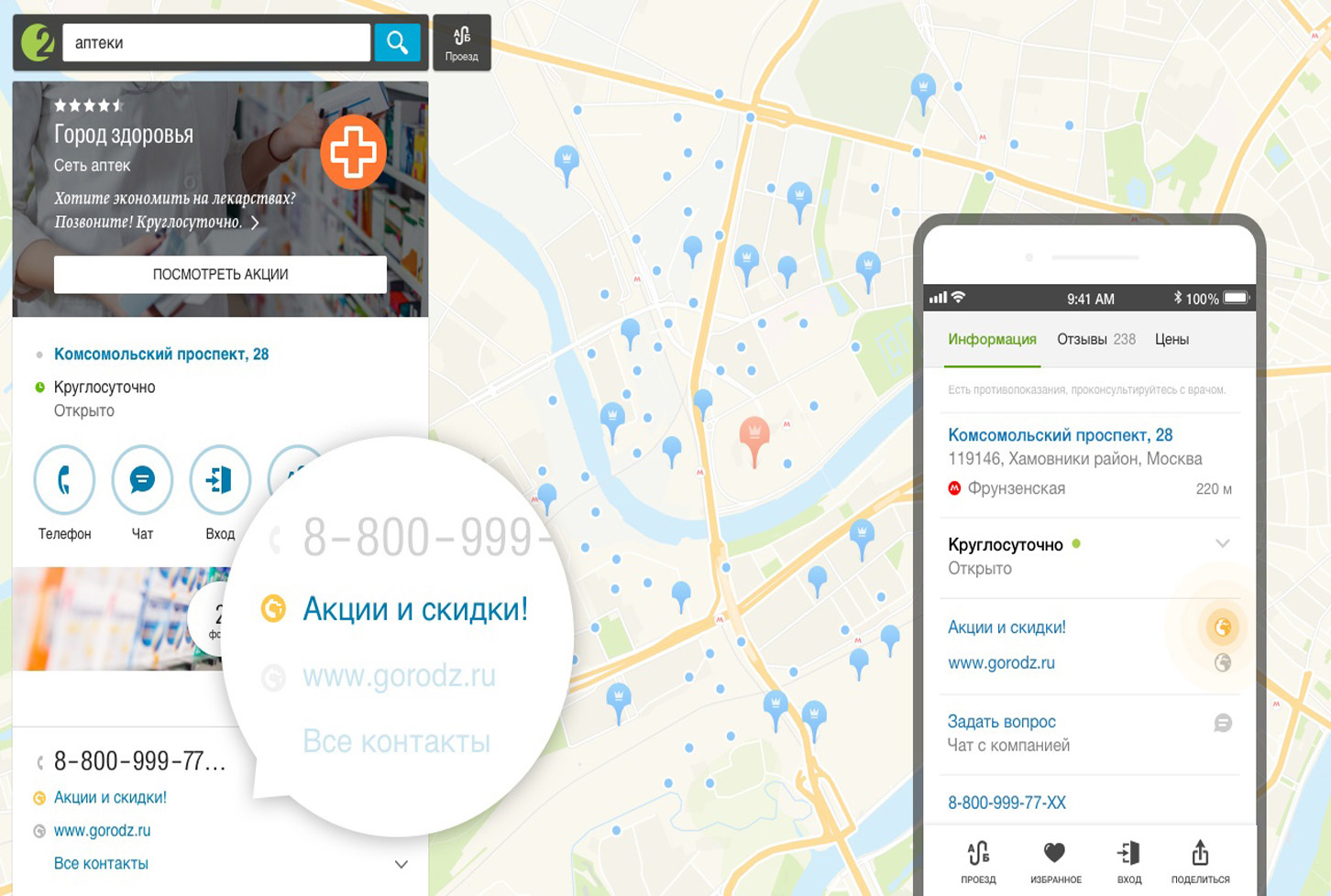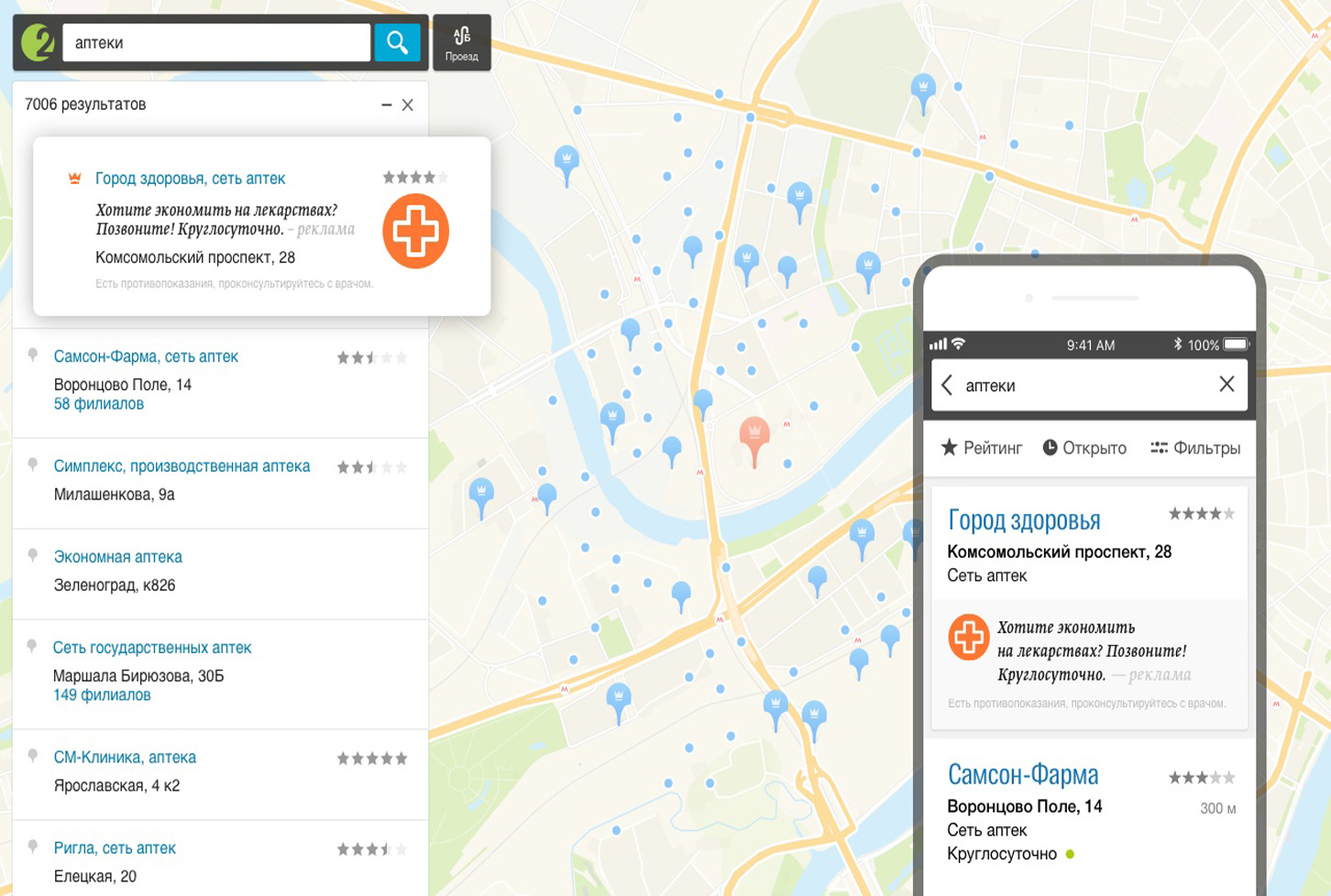 В 2ГИС (Двагис, ДубльГис) доступна геореклама – контекстная и медийная реклама, которую видит пользователь с учетом географии его интересов или текущего местоположения.