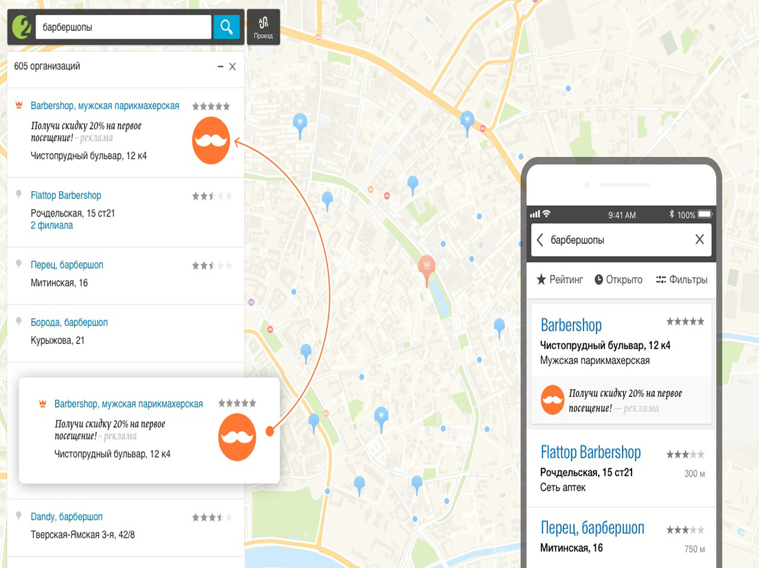 Геоконтекстная реклама видна пользователю в результатах поиска по рубрикам и организациям. Показ геоконтекстной рекламы может зависеть от расположения компании в городе и местоположения (геопозиции) человека, использующего мобильную версию 2ГИС.