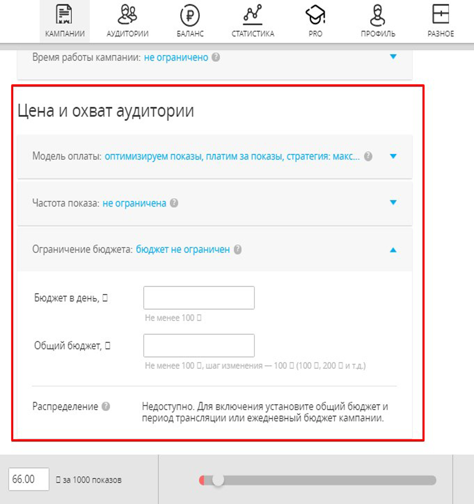3) Ограничение бюджета. Введите сумму, которую вы готовы потратить на рекламную кампанию. Вы можете ограничить сумму в день и общую сумму за весь период. Минимальная сумма — 100 руб. Величина общего бюджета должна быть кратна 100 руб. Общий бюджет считается для всего периода работы кампании. В данном подразделе вы можете также задать распределение бюджета. Быстрое распределение – максимальное количество показов. Используйте, если хотите охватить всех доступных пользователей за минимальный срок. Равномерное распределение – оптимальная интенсивность, учитывающая объем доступной аудитории, период работы, суточный и общий бюджеты рекламной кампании. Равномерное распределение общего бюджета работает, когда установлен период работы кампании.