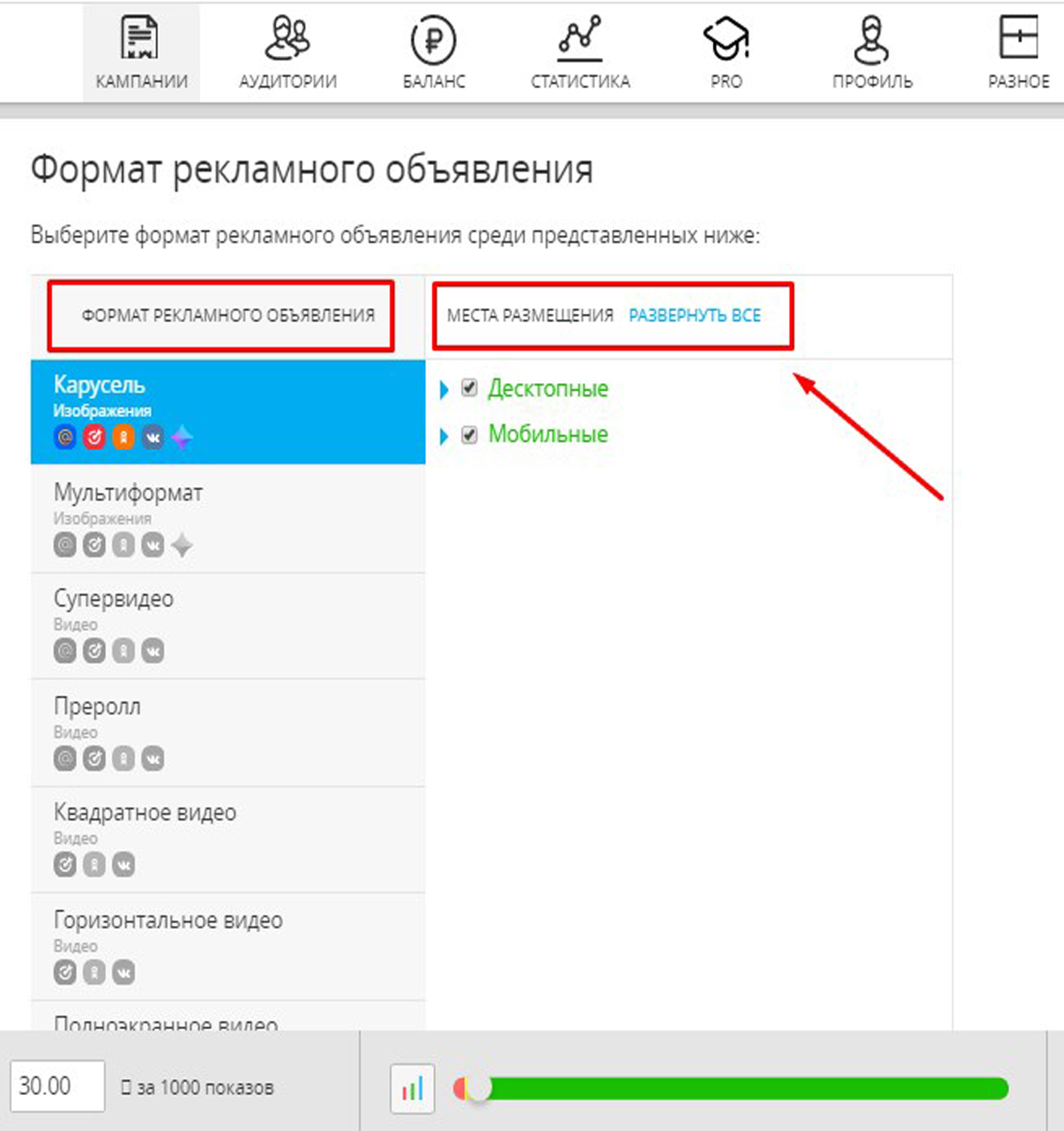 1. В зависимости от площадки размещения рекламного объявления в Одноклассниках: